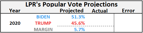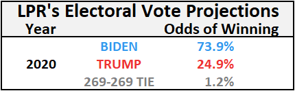 Each of the 50 states has an electoral vote value which equals the total of the number of representatives they have in Congress. There are 435 members of the House, 100 Senators in the Senate, and 3 Electoral votes are awarded to the District of Columbia. Thus, the total number of Electoral votes is 538. Whichever candidate wins a majority of the 538 Electoral votes, therefore 270 or more, wins the Presidency. With the exception of Maine and Nebraska, states award all of their electoral votes to the popular vote winner in their state. However, Maine and Nebraska award 2 of their electoral votes to the popular vote winner for the state and also an Electoral vote to the popular vote winner in each of their Congressional districts - Maine has 2 districts, Nebraska has 3. If you're keeping score, with 50 states, the District of Columbia and the 5 Congressional Districts in Maine and Nebraska, there are 56 different opportunities to win Electoral votes. Mathematically, this translates to over 72 quadrillion possible outcomes. For each outome, there is a an electoral vote total for each candidate and a probability that the outcome occurs. Our Electoral College Daily Tracker follows the probability for each competitive state or district, defined by the latest poll within that state or district. We show the current poll-based probability for Biden in each state. States where the current probability exceeds 90% for either candidate are not included on the daily tracker, but are included in each candidate's total and in the overall probability of winning. ![]()