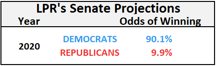 ![]() Method Our poll-based analysis began in 2000 with the Bush/Gore presidential election. In 2010, we began our Senate analysis. Using data from the most recent poll, we determine the probability for the Democratic candidate and the Republican candidate and use these individual race probabilities to calculate the odds for every possible combination of outcomes and calculate each party's odds of winning. We include poll findings from every pollster with these provisions: